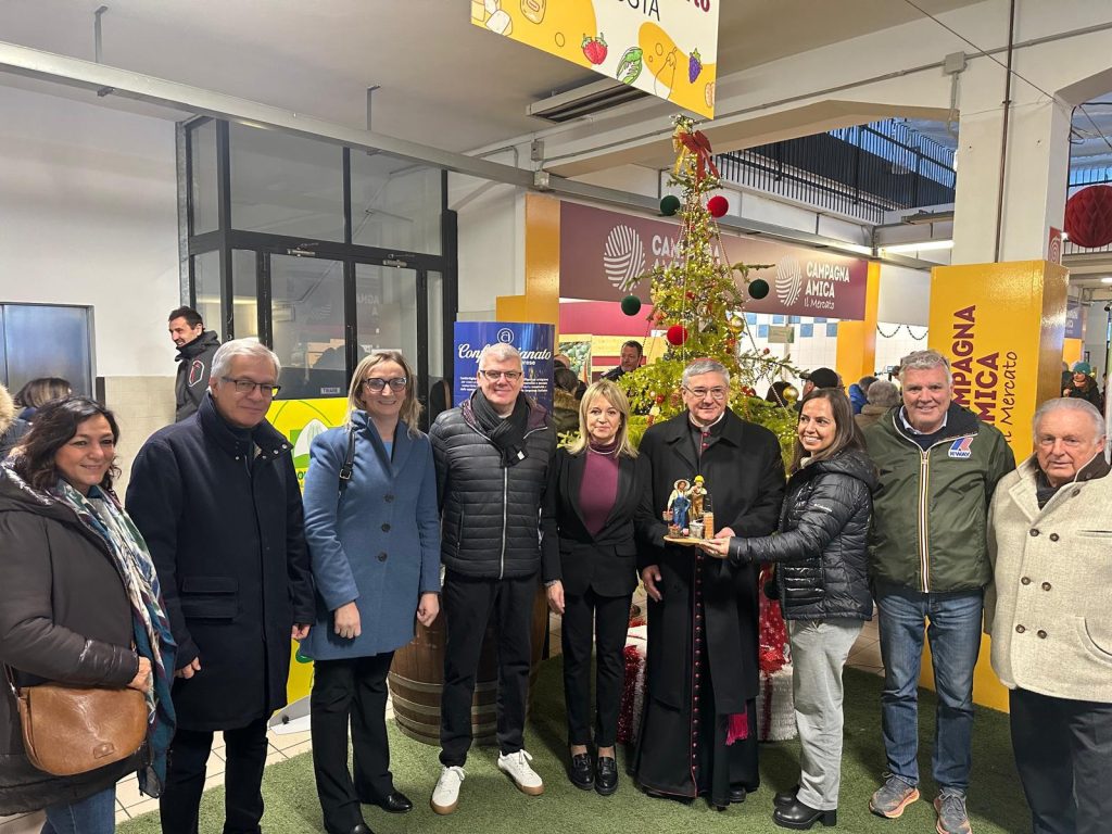 Il Mercato Coperto di Campagna Amica, in piazza Cavalieri di Vittorio Veneto ad Aosta, questa mattina si è trasformato in un luogo di festa e incontro per famiglie, istituzioni e produttori locali. Coldiretti e Confartigianato Valle d’Aosta hanno consegnato a Monsignor Franco Lovignana, Vescovo di Aosta, la statuina del Presepe 2025, dedicata ai temi dell’integrazione, dell’inclusione e della sicurezza sul lavoro nei settori dell’agricoltura e delle costruzioni.